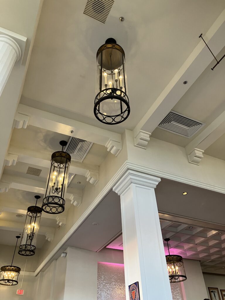 ヒストリックウィングに泊ることができて可愛らしい内装を堪能できたものの、天井の照明が壊れていて点かない。もちろんファンも回らない。さらに両脇のベッドサイドライトは消すことが出来ない。