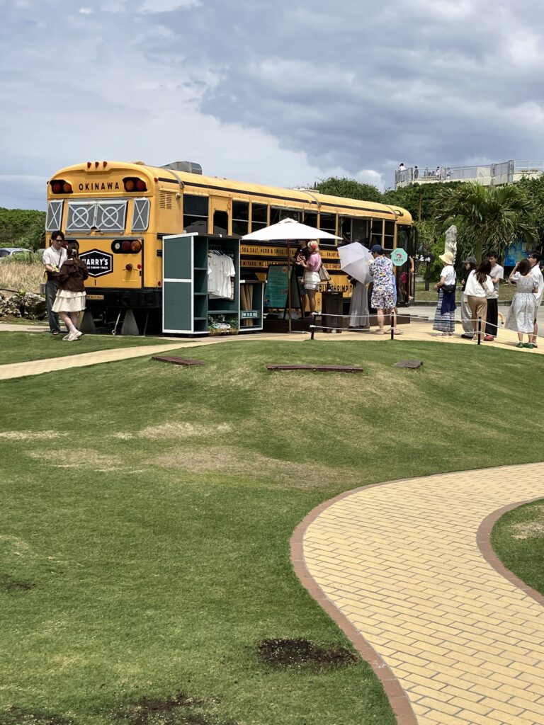 池間大橋の手前、西平安名岬にたたずむ黄色いスクールバス。ここが、本場ハワイの味を再現したガーリックシュリンプの名店です。