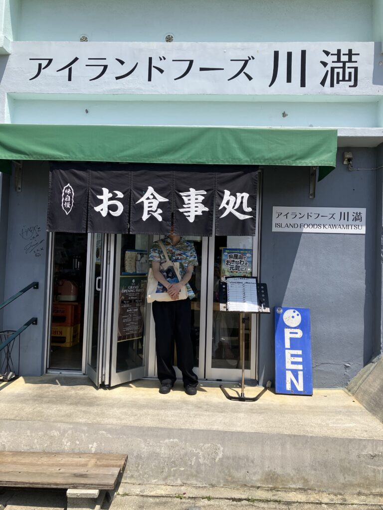 お昼時に訪れたのは、地元の方々に長年愛され続けている名店「かわみつ食堂」。観光客向けというよりは、島の「日常」にお邪魔するような、どこか懐かしい佇まいのお店です。