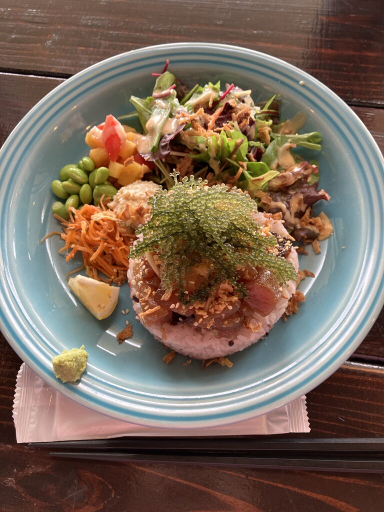 • もずくハンバーグが絶品! 今回いただいたのは、「ポキ丼」と「カレー」。どちらも彩りがすばらしく味も絶品です。